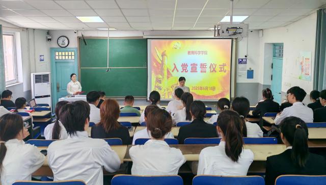 为进一步坚定新发展党员理想信念,提升党员意识和党性修养,6月18日,教育科学学院在4#A124举行2025年上半年新发展党员入党宣誓仪式。学院党委副书记、院长李军,组织员姜文,各支部书记,31名新发展党员以及部分老党员参加此次活动。