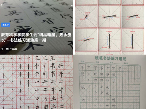 活动前期,活动负责人在工作群内计划活动,同时进行任务分配,以确保活动能够有序进行。同时联系各班班委向同学们介绍此次活动,鼓励各班同学积极参加。负责人提前组建活动群,并提醒报名成功的同学及时入群。相关负责人提前在群内发布与“书法基本笔画”有关的视频及练字时的注意事项,并为同学们科普书法知识。活动要求,每位参加活动的同学按照活动负责人在活动群中提前发布的有关“书法”的诗句或优美段落,从软笔和硬笔两种类型中任选一种进行为期一周的书法练习,并每天将自己的练字作品拍照上传到活动群中。同学们纷纷表示:“即使活动结束了,也会一直坚持练字,来提高个人修养,不丢弃这个良好的习惯。”活动后期,负责人将参加活动的同学们上传的练字作品进行收集、整理,并提醒同学们及时在到梦空间签到。