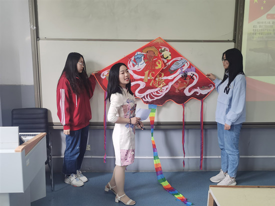 同学们将自己制作纸鸢的过程做成ppt进行轮流展示。同学们通过有趣的讲解,将自己的设计理念表达出来。有同学在纸鸢上融入“新疆棉花”元素,将棉花染成彩色镶嵌到风筝上,并在讲解中提到“棉花虽轻,但是加上中国两个字便显得格外厚重”,风筝加上长绒棉的设计理念想要让中国最骄傲的棉花在天空翱翔。另一组将中国共产党成立的艰辛历程在风筝上通过绘画的形式展现出来,伴随着引人入胜的讲解,将同学们带到那段艰难的岁月中去,同学们利用制作纸鸢的契机,致敬建党100周年,引起了全场观众的共鸣。