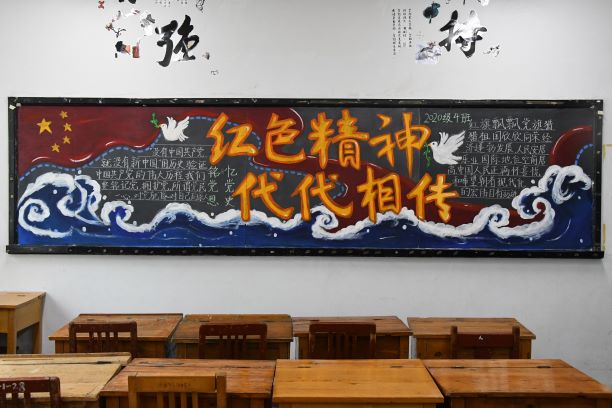 活动共分为线下绘制和线上打分两个部分。各班同学通过网上搜集素材并运用彩色粉笔、水彩等材料进行黑板报的绘制。从精美的图案、风格迥异的版面设计、优美的文字中,体现出对党和国家的礼赞与热爱。9班同学的黑板报中,复兴号行驶在一条贯穿整个板面的红绫上,展现出中国速度与民族正气,画面中部是由镰刀和锤头组成的中国共产党党徽,右部是水立方、东方明珠等著名建筑,形象地展现了建党一百年来我国在党的领导下飞速发展的过程。4班“红色精神,代代相传”的标题辉煌夺目,板报下激烈翻涌的浪涛和天空中雄雄飘扬的五星红旗形成了鲜明的对比,展现出中国共产党不畏艰难、奋勇向前的气魄。
