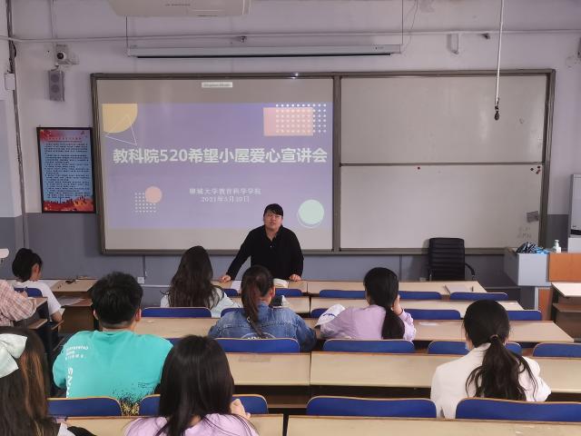 为进一步做好共青团系统青春扶贫工作,推动新时代希望工程工作转型升级,根据统一工作部署, 聊城大学教育科学学院于5月20日在4C221举办520希望小屋爱心宣讲会,团委书记吴伟伟进行宣讲,各班团支书参与。
