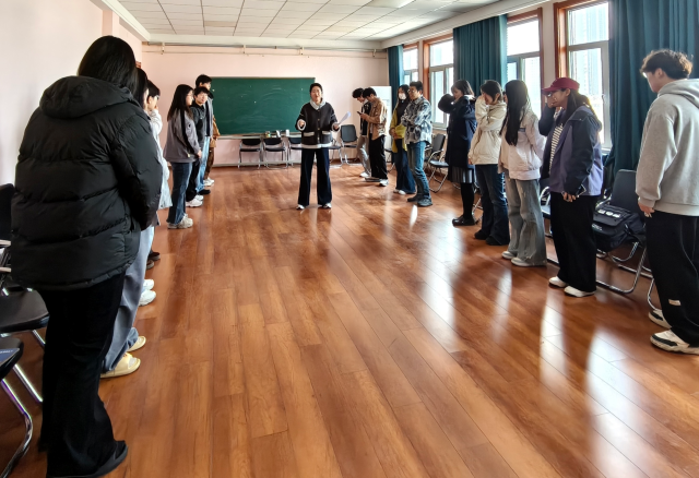活动伊始,参与者被分成两个小组,每组10人。首个环节为“滚雪球”式自我介绍,第一位成员介绍自己的姓名、家乡及个人特点,第二位成员需先复述前者的信息,再介绍自己,以此类推,直至最后一位成员完整复述全组信息。这一过程考验了同学们的专注力,迅速拉近了成员间的心理距离,营造出轻松、包容的团体氛围。随后进入互动体验环节。在“我说你画”中,一位成员描述抽象图形,其余成员仅凭语言指令作画,在信息偏差与“误解”中体会沟通的完整性与倾听的重要性。“盲人过桥”则让成员两两搭档,一人蒙眼,另一人用语言引导其通过预设“障碍路线”,在信任与协作中感受支持的力量。最后“人体‘拷贝’”要求成员用肢体动作依次传递词语,在无声的默契配合中激发欢笑与共鸣。三项活动层层递进,引导同学们在沉浸式互动中放下拘谨,自然融入集体。