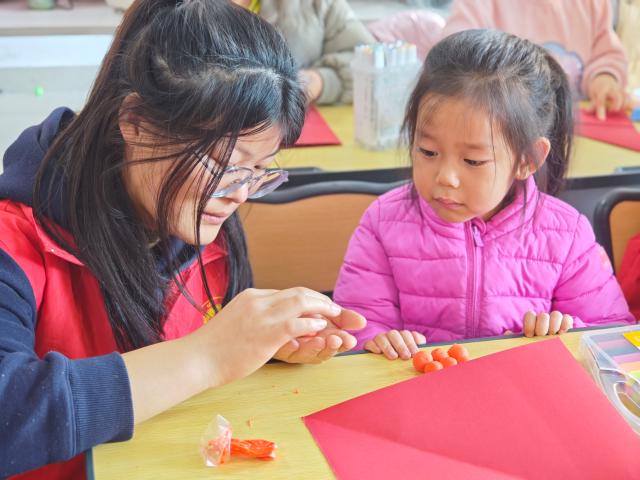 活动前期,服务队的志愿者们认真筹备,精心准备了各种颜色的黏土、中国结线材、扭扭棒等手工材料。同时,服务队负责人组织志愿者们进行了详细的培训,让他们熟悉了每一种材料的使用方法以及各类手工制品的制作要点,以便能在现场为小朋友们提供专业的指导,力求每位小朋友都可以顺利制作出满意的手工作品。 活动现场,志愿者先向小朋友们展示了基础的制作步骤,细致地教他们如何运用材料进行创作,小朋友们也积极互动,相互交流学习,在欢声笑语中,一个个充满新春气息且彰显中国传统文化韵味的手工作品相继诞生,小朋友们制作的新春圆盘剪纸作品、用黏土装饰的“福”字板以及扭扭棒玩偶搭配的“福”字吊牌等,都充满了新春氛围。活动结束后,志愿者们选取了孩子们的优秀作品进行展示,并与小朋友们合照,记录下了这个美好的瞬间。