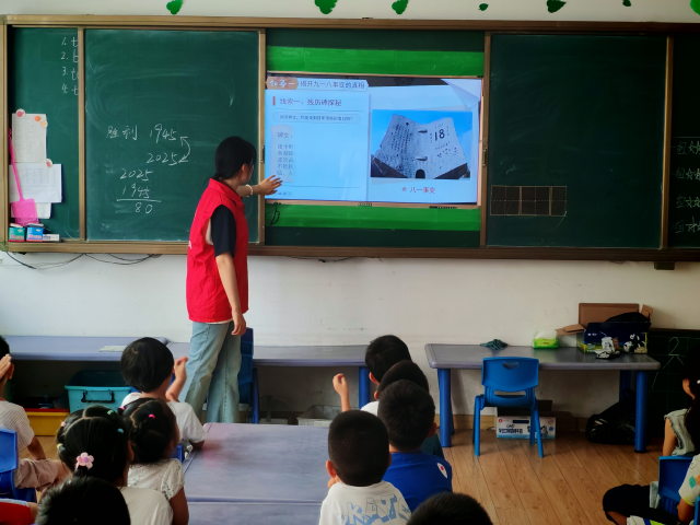 活动当天,志愿者以“时光小火车”游戏拉开活动序幕,小朋友们跟随着旋律兴奋拍手,现场气氛活跃。随后,志愿者通过展示“残历碑”图片,向小朋友们讲解了“九一八事变”,并用动画短片串联起历史关键事件,告诉孩子们中国人民通过英勇反抗最终取得了抗战胜利。志愿者还以简单易懂的话语讲述了“八女投江”的故事、英勇杀敌的赵登禹将军和机智送情报的海娃等人物的英雄事迹,娓娓道来的故事让在场的小朋友们进一步了解了中华民族的抗战精神。最后,志愿者向小朋友们分发彩纸,教会他们和平鸽的折法,在互动中引导他们领会和平的重要性,将“铭记历史 珍惜和平”的理念根植于心。