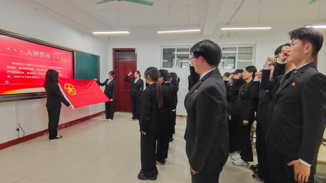 入团仪式在嘹亮的国歌声中拉开帷幕。主持人宣读新团员名单,参会老师与优秀党员代表共同为新团员佩戴团徽徽章,并颁发团员证。在优秀团员代表堵钟心的领誓下,团员们面向团旗,举起右手,庄严宣誓。新团员代表葛保希表示,将时刻以团员标准要求自己,不断提升思想觉悟,在实践中开阔眼界、增长才干,以青春之我、奋斗之我践行入团誓词,在服务集体、奉献社会的过程中发光发热。优秀团员代表堵钟心在发言中呼吁新团员们要永葆爱党爱国的赤诚情怀以及向上向善的优秀品质,不断学习科学文化知识,同时也不忘将理论运用到实际生活当中,为团组织的发展和国家的繁荣富强贡献自己的青春力量。团委书记王瑾对新团员们的加入表示热烈地祝贺,她希望同学们时刻牢记团员身份、筑牢信仰之基,自觉锤炼品格、强化政治素养,主动将个人成长融入时代发展,在实践中勇挑重担、积极作为,用实际行动诠释共青团员的责任与担当。入团仪式在合唱中国共产主义青年团团歌中圆满结束。