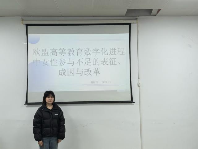 戴同玲以《欧盟高等教育数字化进程中女性参与不足的表征、成因与改革》为题展开汇报,她首先指出“女性在科学中的缺席”是全球性现象,开发利用被低估的女性科技人才资源,是21世纪提升国家综合实力的战略议题。随后,她结合欧盟发布的关键政策,归纳了女性参与不足的主要表现并剖析其成因。最后,她系统总结了欧盟已实施的改革措施,旨在为我国应对同类问题提供有益参考。
