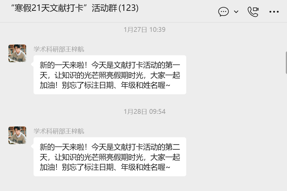 此次文献阅读打卡活动自1月27日正式启动,至2月27日圆满落幕,全程共计21天。活动以学习小组为单位,依托“小打卡”微信小程序进行打卡记录。活动期间,共有119名研究生积极参与,在寒假的时光里坚持与学术对话。工作人员每日在活动群内发布温馨提醒,激励同学们保持学习状态;同学们则围绕各自的研究方向,潜心研读高质量文献,营造了浓厚的学术氛围。