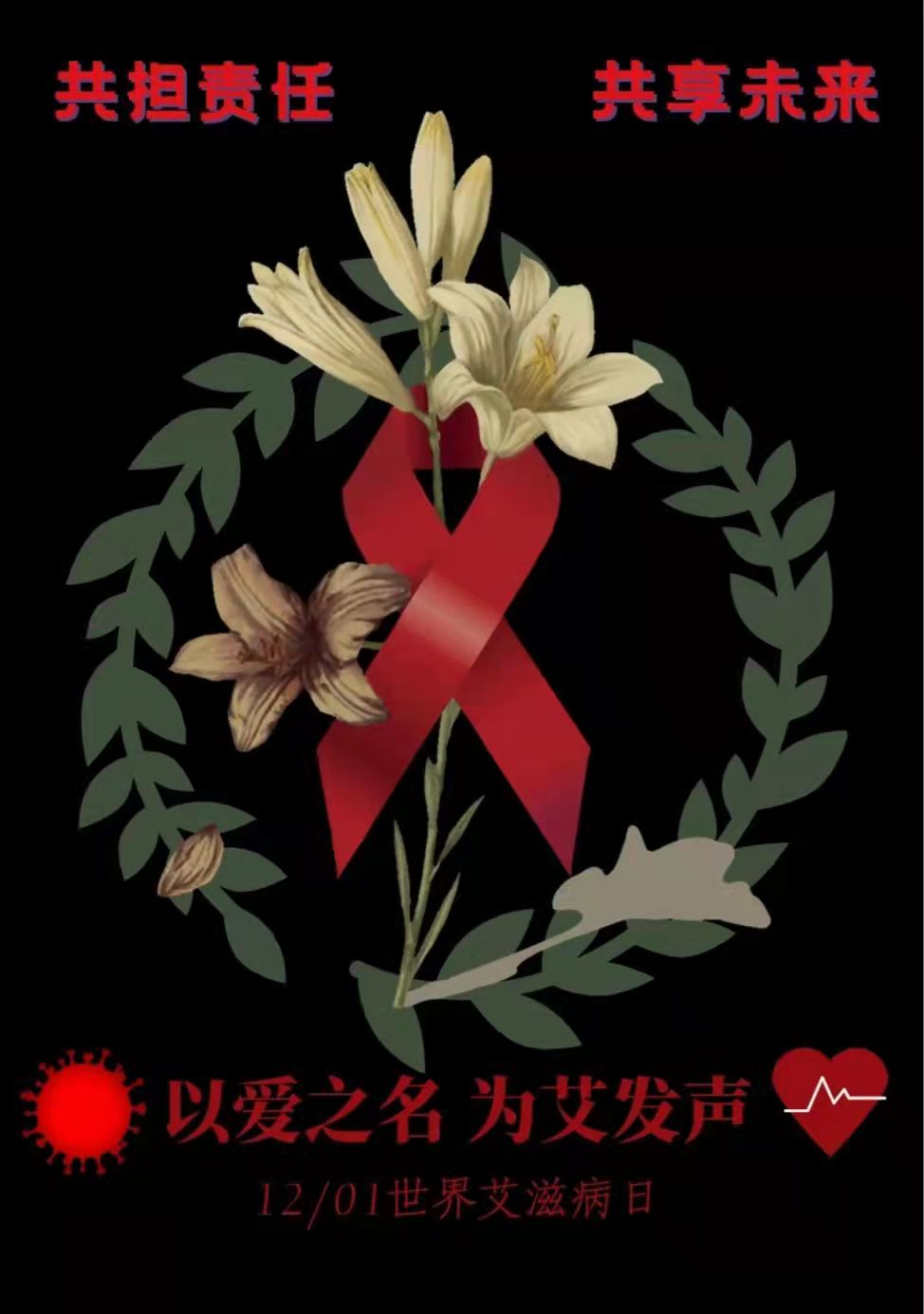 活动开始前参赛者需要将参赛作品发到指定邮箱,所有作品在活动开始后于聊大教科公众号上进行展示,并进行线上投票。活动过程公平、公正、公开,同学们依据自己对作品的喜爱程度进行投票选择。张鑫颖同学采用红丝带环绕花朵的图案作为海报的主体,表明艾滋病患者的生活同样需要鲜花的环绕,暗示了艾滋病病人需要关爱,“共担责任,共享未来”的口号,呼吁大家学会包容艾滋病患者;张明哲同学的海报简洁大方,中英结合的语言、凝练的标语展现了强大的呼吁能力;冯婕同学则采用小图标汇聚的形式,男性和女性的标志、寻求帮助的双手、爱心的演绎等,赋予了红丝带立体感。参赛者的作品都充分表达了呼吁全社会关心关注艾滋病患者的愿望。经过两天的投票,张鑫颖同学获得一等奖,赵中莹、张明哲同学获二等奖,费子晨、冯婕、毛钦迪同学获三等奖。