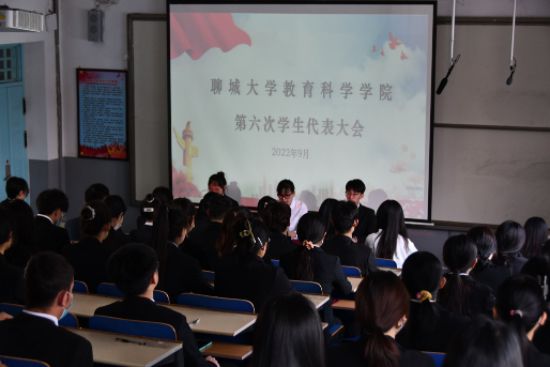 为加强学生会组织建设,发扬民主,共同谱写教育科学学院学生会工作新篇章。2022年9月24日上午,教育科学学院第六次学生代表大会在4C221隆重召开。教育科学学院团委书记王瑾和80名学生代表参加会议,2022届学生会主席刘丰源担任主持人。