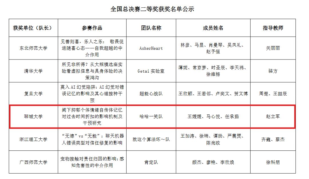聊城大学教育科学学院学子在此次比赛中表现优异,“哈哈一笑队” 凭借作品《阈下抑郁个体情绪自传体记忆对过去时间折扣的影响机制及干预研究》荣获全国总决赛二等奖,展现了我院学子扎实的专业素养与卓越的科研能力。