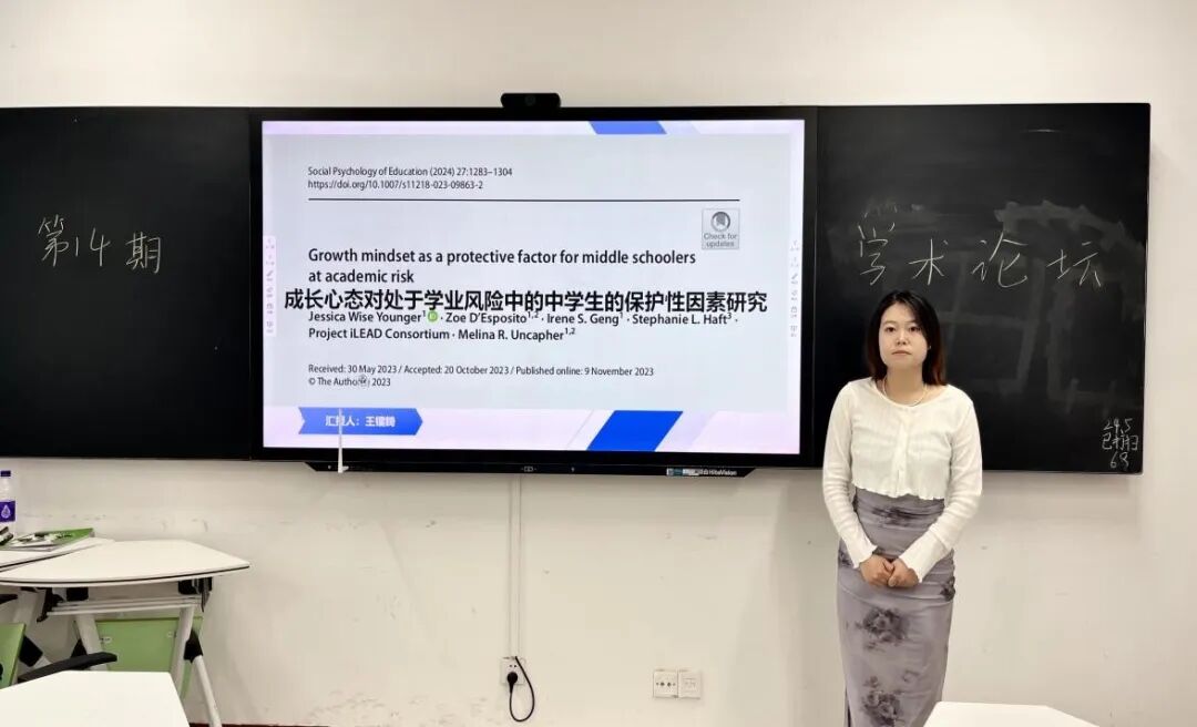 6月10日,教育科学学院在4#C118举办研究生学术论坛,本次论坛由2024级心理学学硕研究生王镭錡主讲,主题为《成长心态对处于学业风险中的中学生的保护性因素研究》。学院心理学教授周琰担任点评教师,部分研究生参会。