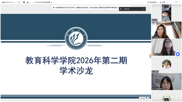 2月10日,教育科学学院于线上成功举办2026年第二期研究生学术沙龙。本次沙龙由学术科研部徐海静主持,杨玉茹、胡丽萍、周金铭和段钰四位同学担任主讲人,围绕“第十三届山东省课程与教学论学科协作发展会议”的内容进行了学术报告与经验分享,学院部分研究生参加。