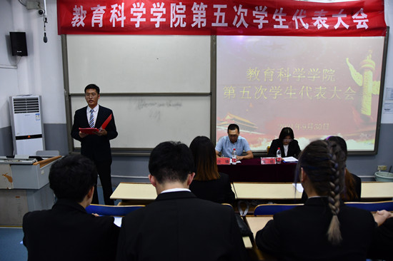 为确保学生会有效行使职能,切实服务广大同学,聊城大学教育科学学院于9月30日在西校区4#A224召开第五次学生代表大会。辅导员任锋和90位学生代表参加此次会议,学生会主席张铭担任主持人。