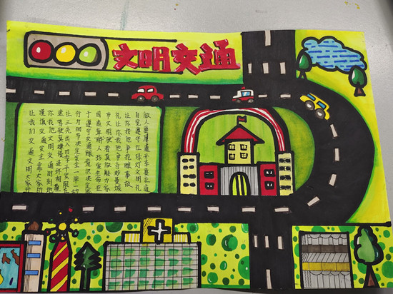比赛采取线上模式,邀请5位评委进行百分制评分,共收到49份作品。其中张致远同学的作品以文明交通为主题,绘画出现代社会的高楼大厦以及公路交通,以鲜明的色彩提醒大家一定要遵守交通规则,礼让行人,少一点争抢,多一点文明,主题深刻,得到评委的一致好评;冯亚冉同学的《礼仪之邦》,以中国传统的熊猫和竹子为主要背景,熊猫憨态可掬,竹子生机盎然,其内容也是在宣扬中国是传统的礼仪之邦,呼吁同学们发扬中国传统文化,文明举止,用礼仪接待客人;赵晓菲同学的作品以中国龙为背景,强调中国传统”礼义廉耻”。大赛历时两天,在经过初审、复审和终审三个环节层层选拔后,最终评选出一二三等奖。