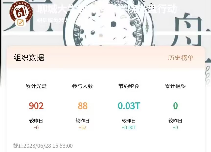 活动通过微信“光盘打卡”小程序进行,参与者通过上传早中晚三餐的光盘照片进行活动打卡。活动一经发布同学们纷纷报名,踊跃参与,更新自己一日三餐的光盘照片,争做节约粮食践行者。